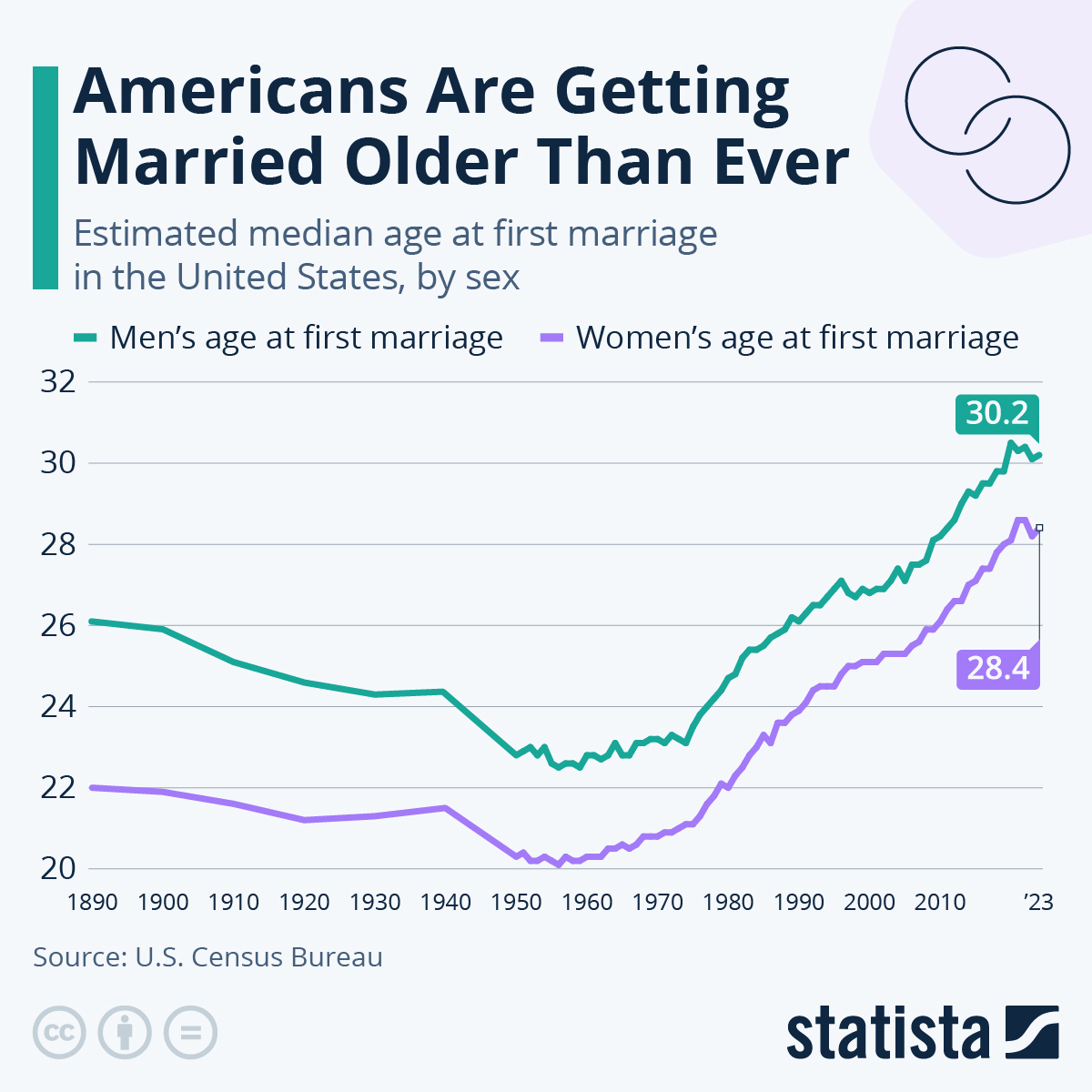 Americans are delaying (or putting off altogether) getting married for longer than before, according to data from the U.S. Census Bureau. The median average age for men to first get married has risen to 30.2 years in 2023, while for women the figure is 28.4 years.