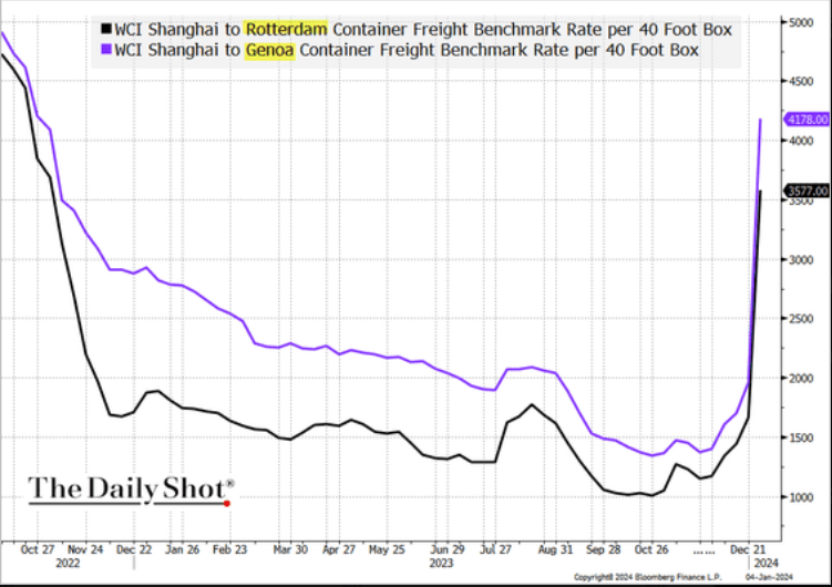 Shipping costs from Asia to Europe are surging as vessels are forced to avoid the Red Sea. pic.twitter.com/phmuwCfF0O