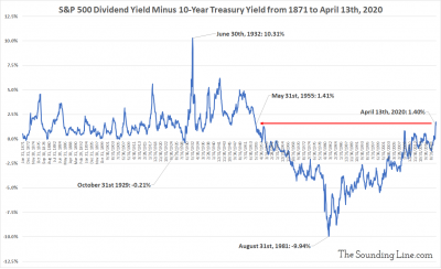 Stocks now solidly out ‘yield’ bonds by the most since 1955 and by roughly the average amount from 1871 through 1955